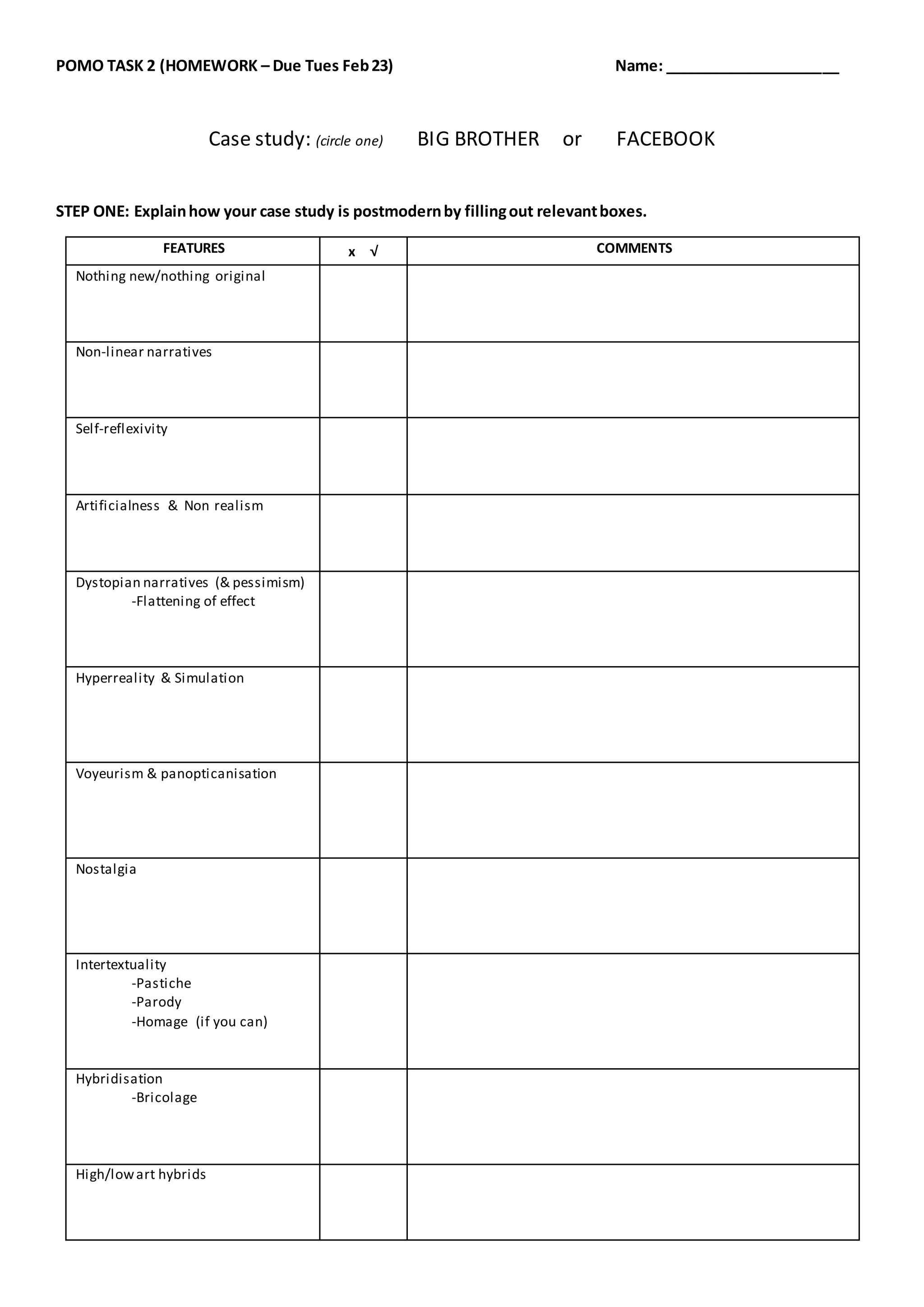 This document outlines the steps for a homework assignment on analyzing reality television shows like Big Brother or social media platforms like Facebook from a postmodern perspective. Students are asked to: 1) Explain how their case study demonstrates postmodern features like non-linear narratives and simulation; 2) Compare their case study to traditional media forms; 3) Discuss how it challenges traditional relationships between texts and audiences; 4) Analyze how it enables audiences to behave differently than in the past; 5) Consider how it impacts representation; and 6) Identify arguments for and against their case study in terms of impacts and implications.