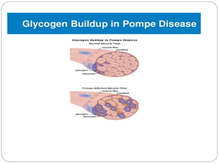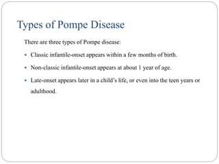 Pompe disease has three types: classic infantile-onset, non-classic infantile-onset, and late-onset, with varying appearance times and symptoms in infants, children, or adults. It is caused by a mutation in the gaa gene leading to acid maltase deficiency, resulting in sugar accumulation in muscles and organs, and can be inherited in an autosomal recessive pattern. Diagnosis involves enzyme tests and imaging, while treatment primarily includes enzyme replacement therapy alongside supportive care such as physiotherapy and dietary adjustments.