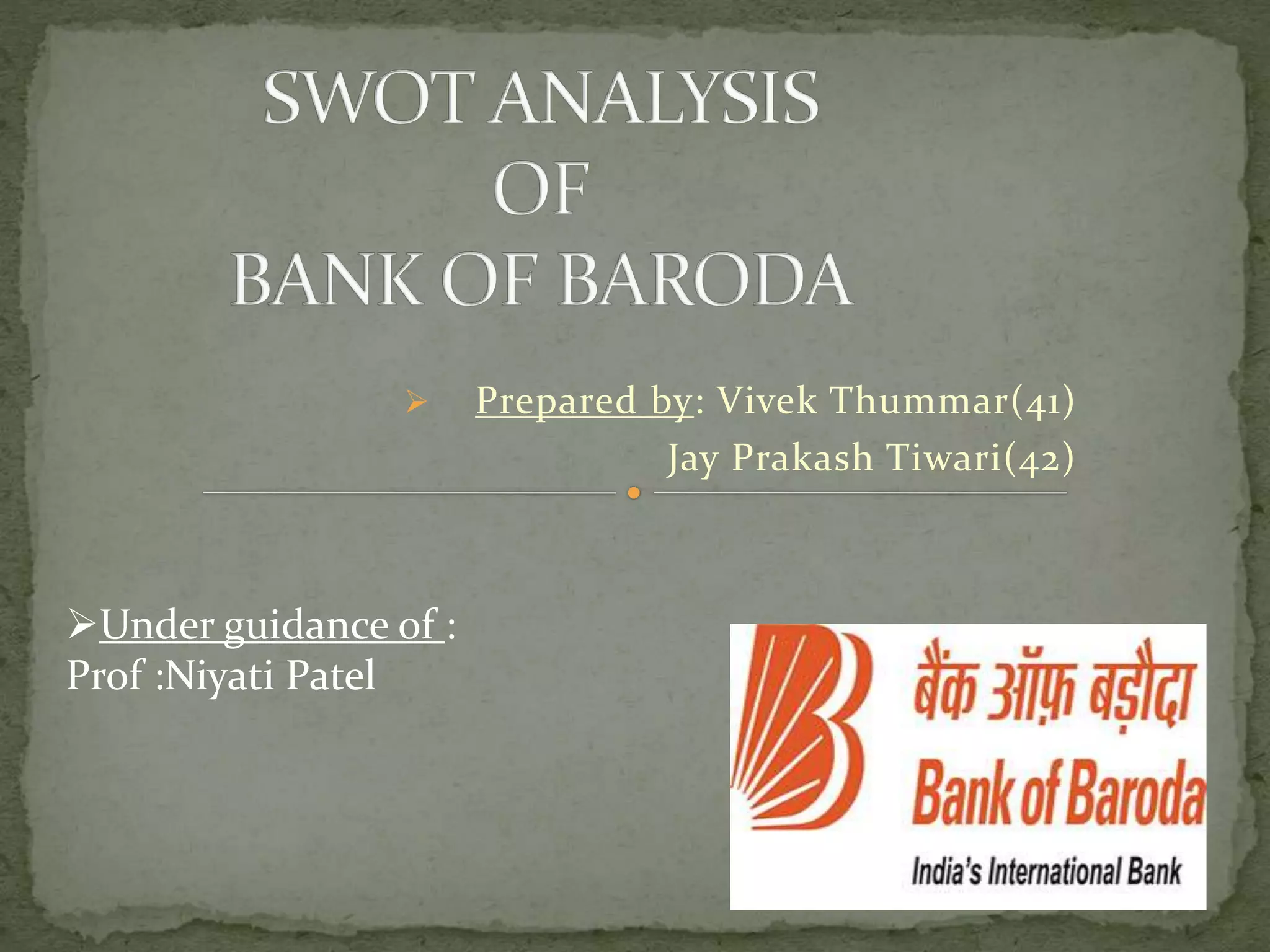 This document summarizes information about Bank of Baroda (BOB). It was established in 1908 and was one of the first Indian banks to open an overseas branch in 1953 in Mombasa, Kenya. BOB provides various banking services internationally and domestically, including services for non-resident Indians. Its mission is to be a top-ranking national bank committed to stakeholder value. The bank aims to regain market leadership and double its global business by 2020. Key strengths include its large size and international presence, while opportunities exist in expanding rural outreach. Potential threats come from new banking licenses and competition from foreign and cooperative banks.