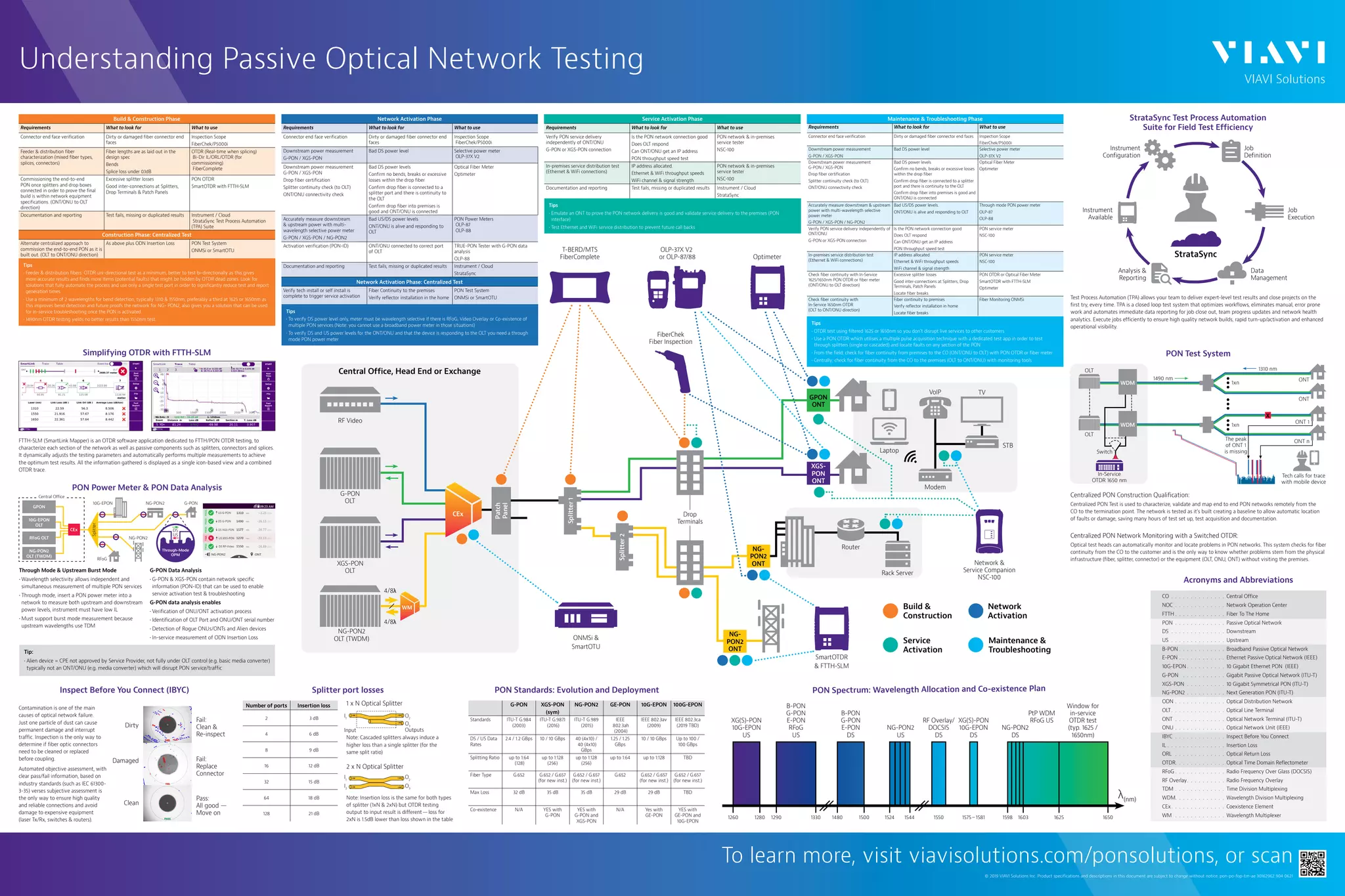 This document discusses fiber optic testing equipment and methods for different phases of fiber to the premises (FTTP) network deployment and maintenance. It recommends using optical time domain reflectometers (OTDRs) with multiple wavelengths to characterize fibers and locate faults. Centralized testing during construction can validate the network before activating services. Maintenance involves verifying power levels and continuity to troubleshoot issues without visiting customer sites using monitoring systems. Centralized and automated testing helps ensure high quality fiber connections and networks.