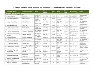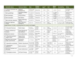 This document provides a list of native plant species suitable for ponds, pondsides, and streamsides in western Los Angeles County, California. It includes over 50 species of trees, shrubs, vines, and perennials categorized by size, flowering season, light and soil requirements, and water zone. Many of the listed species are suitable for upper stream banks and tolerate seasonal flooding. Several are fragrant or provide berries for wildlife.