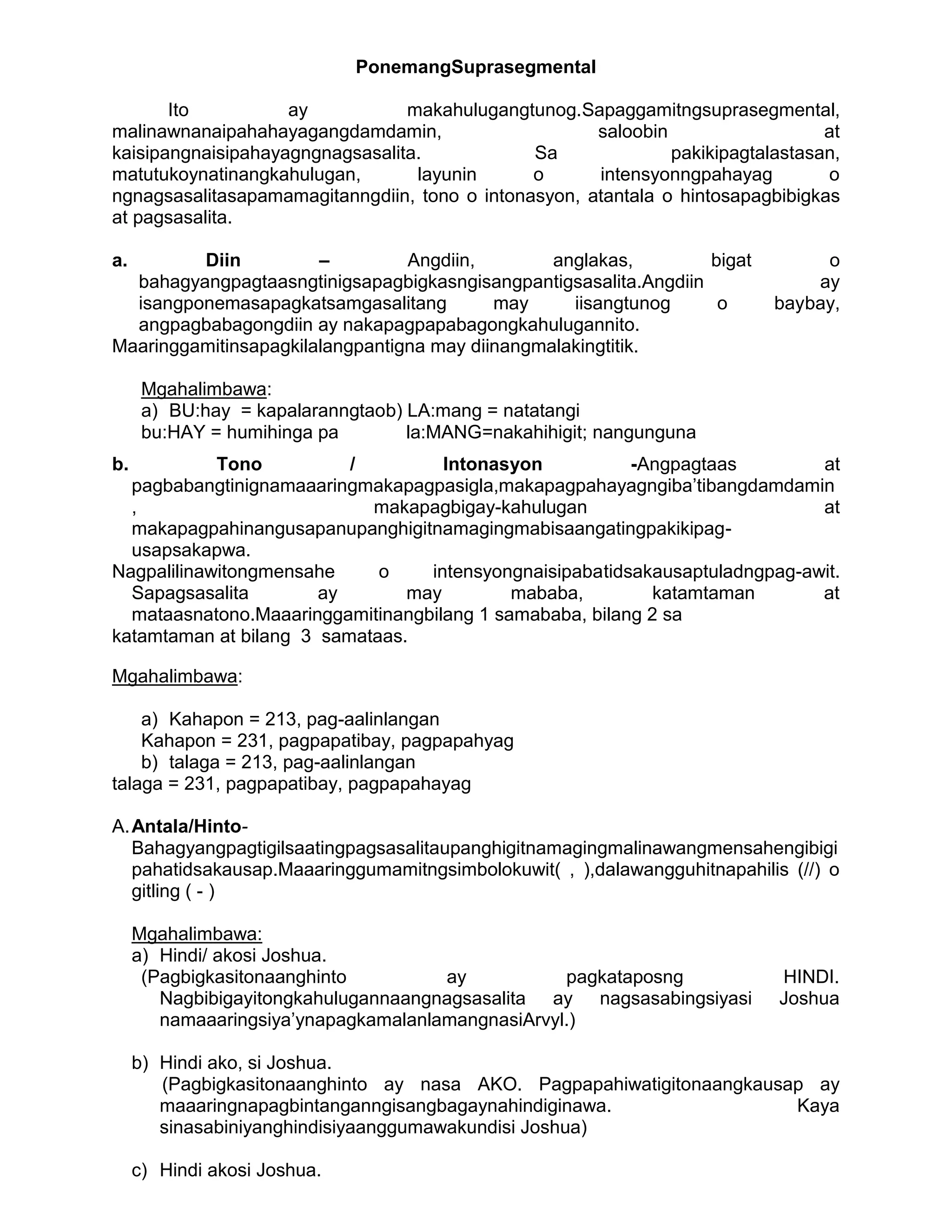 Ang ponemang suprasegmental ay mahalaga sa pagpapahayag ng damdamin, saloobin, at kaisipan ng nagsasalita. Kabilang dito ang diin, tono o intonasyon, at antala o hinto na nagbibigay ng kahulugan at nagpapalinaw ng mensahe sa pakikipagtalastasan. Sa tamang paggamit ng mga elementong ito, mas nagiging epektibo at maliwanag ang komunikasyon.