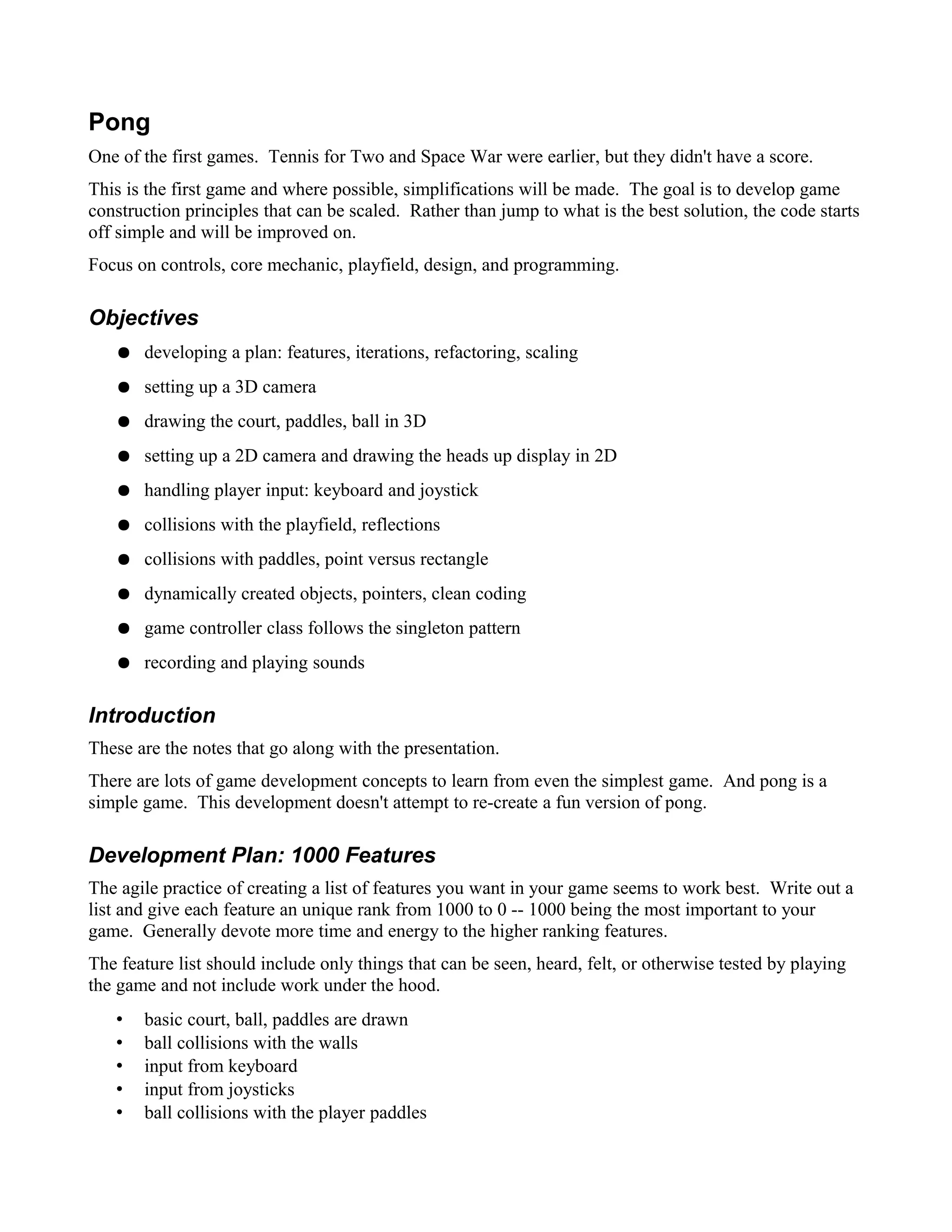 This document provides an overview and development plan for creating a basic Pong game. It discusses focusing on core mechanics like controls, gameplay, and programming. The plan involves iteratively developing features starting with basic elements like drawing the court and balls, then adding player input and ball collisions. It emphasizes taking an iterative approach, with development occurring in small steps that can be completed in a single sitting to allow for consistent progress. The document also provides guidance on object-oriented programming principles, memory management, and structuring the game controller class to manage the game loop and different game states.