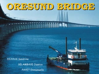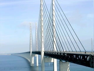The Oresund Bridge connects Denmark and Sweden across the Oresund Strait between Copenhagen and Malmo. Construction began in 1995 and included building an artificial island and a tunnel. The bridge opened in 2000 and is over 7 kilometers long, making it the longest combined bridge-tunnel structure in the world. It carries road and rail traffic across the strait using concrete immersed tunnel sections and a cable-stayed bridge design.