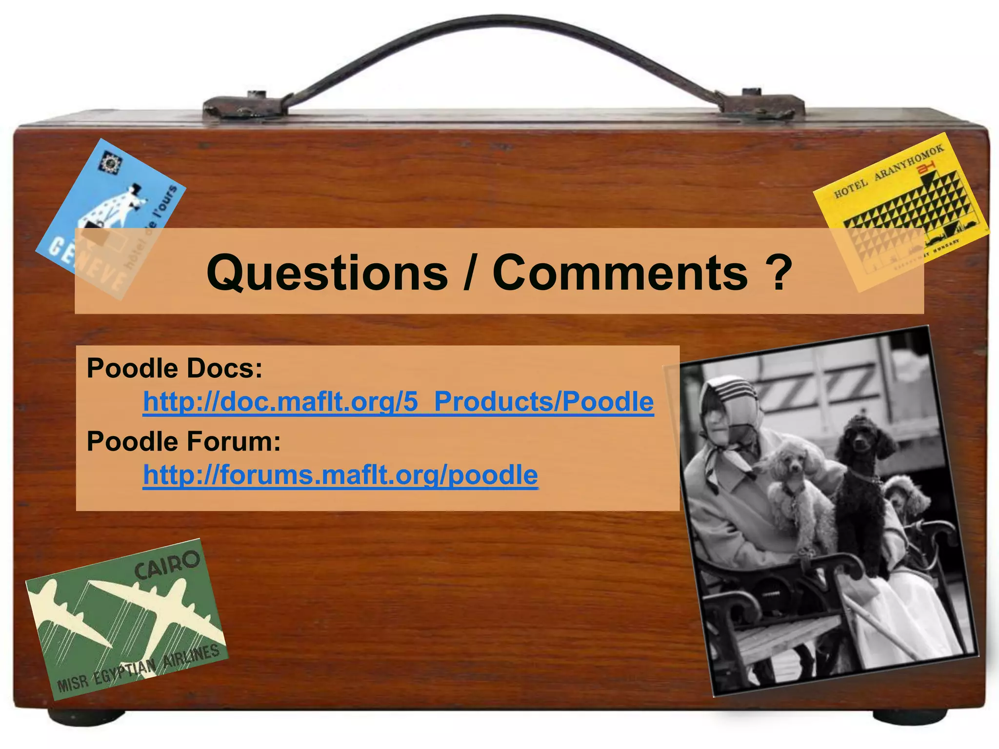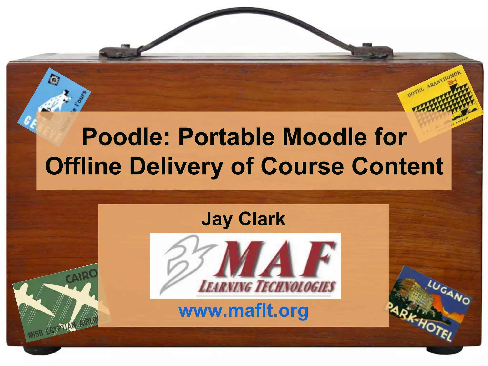 Poodle is a portable version of Moodle designed for offline course content delivery, enabling users to create, enroll, and manage courses without an internet connection. It allows the configuration of themes and courses, and can be transferred to USB drives for ease of use. The document provides instructions for downloading and setting up Poodle, as well as links to additional resources and support.
