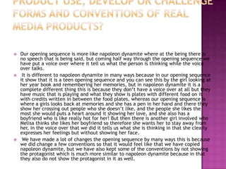 The document summarizes the opening sequence for a teen film. It compares the opening to Napoleon Dynamite, noting differences in conventions used. The opening uses a voiceover of the main character's thoughts as she looks through her yearbook. It represents teenagers and social groups, showing the main character's feelings about a boyfriend and another girl. The intended audience is ages 12+ and distribution could be through Film4 or Channel 4. Various technologies were used in creating the opening, including iMovie and cameras.