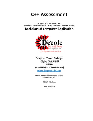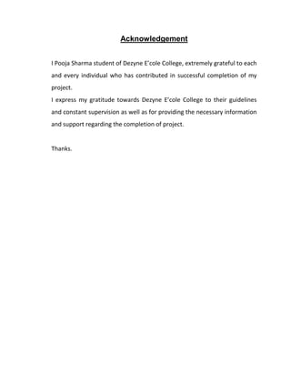 The document is a student project report submitted by Pooja Sharma for their BCA degree. It includes an acknowledgement thanking those who helped, a synopsis stating it is a C++ project to strengthen practical concepts, and the coding for a student management system with options to add, show, search, modify, and delete student records from a text file.