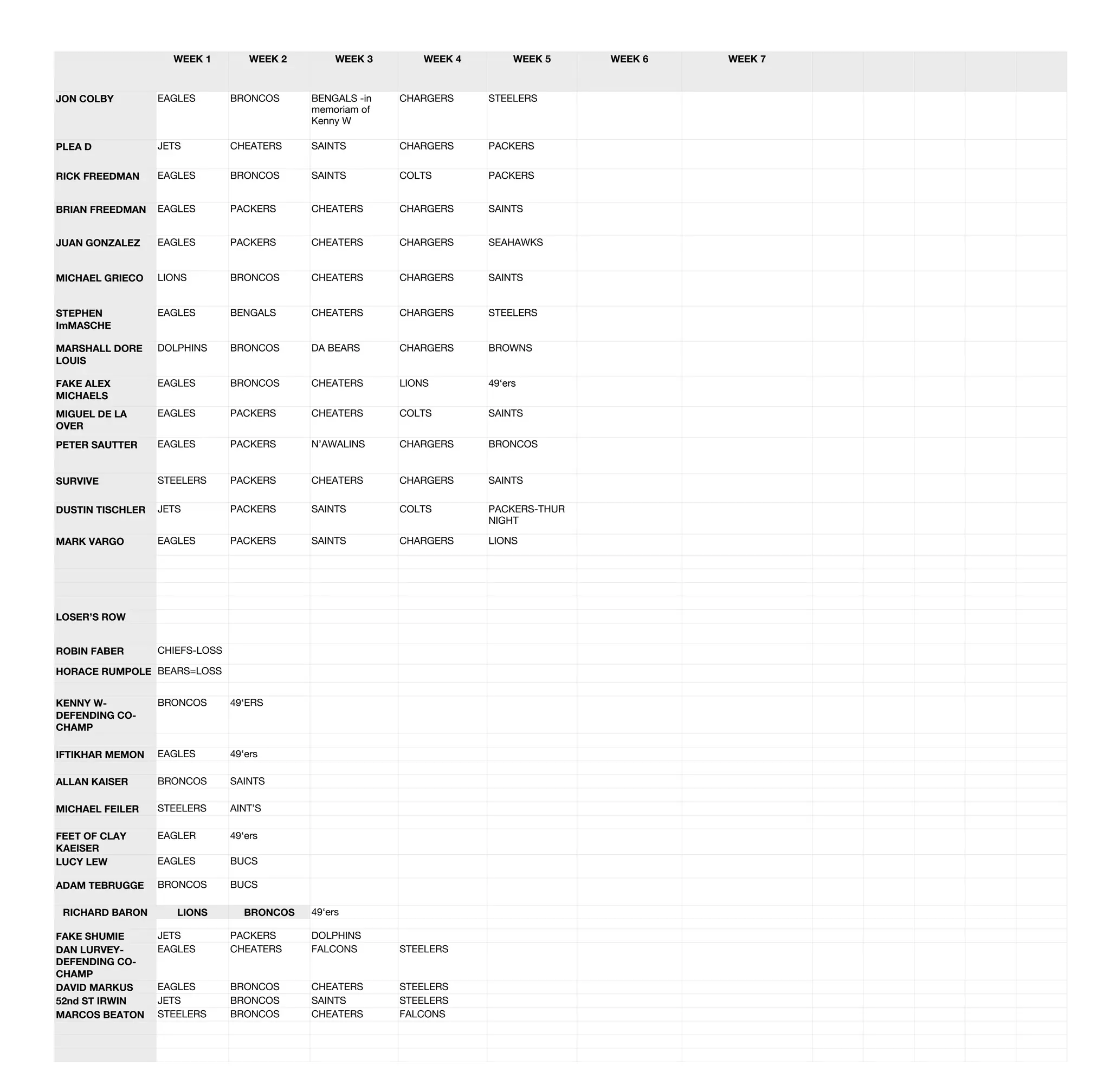 This document appears to be a list of weekly fantasy football matchups over a 14 week season, with team names listed horizontally for each matchup. Several users are identified as having the best records, including Jon Colby, Brian Freedman, and a co-champion pairing of Iftikhar Memon and Dan Lurvey-Defending. The matchups include many NFL team names like the Eagles, Packers, Broncos, Saints, and references to teams nicknamed Cheaters.