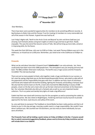 The document provides updates from the Poop Deck Club including: