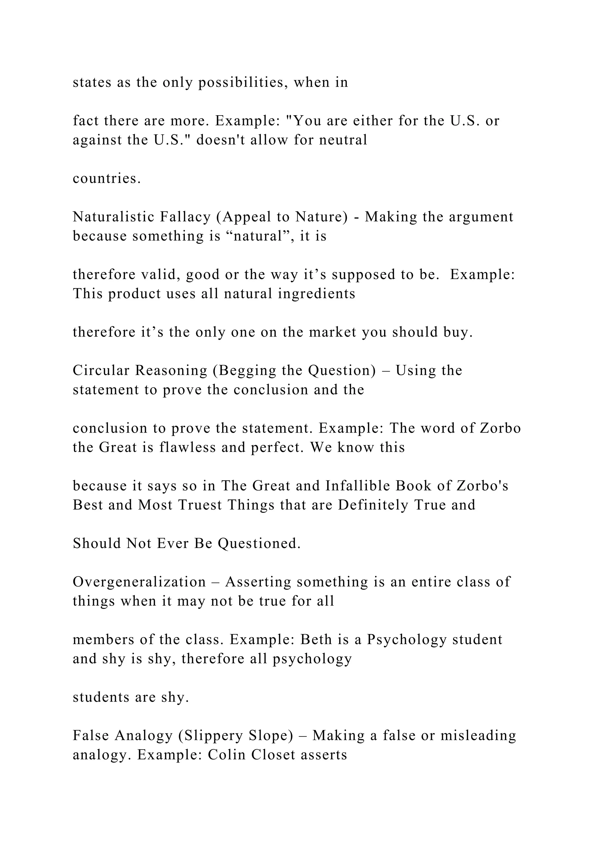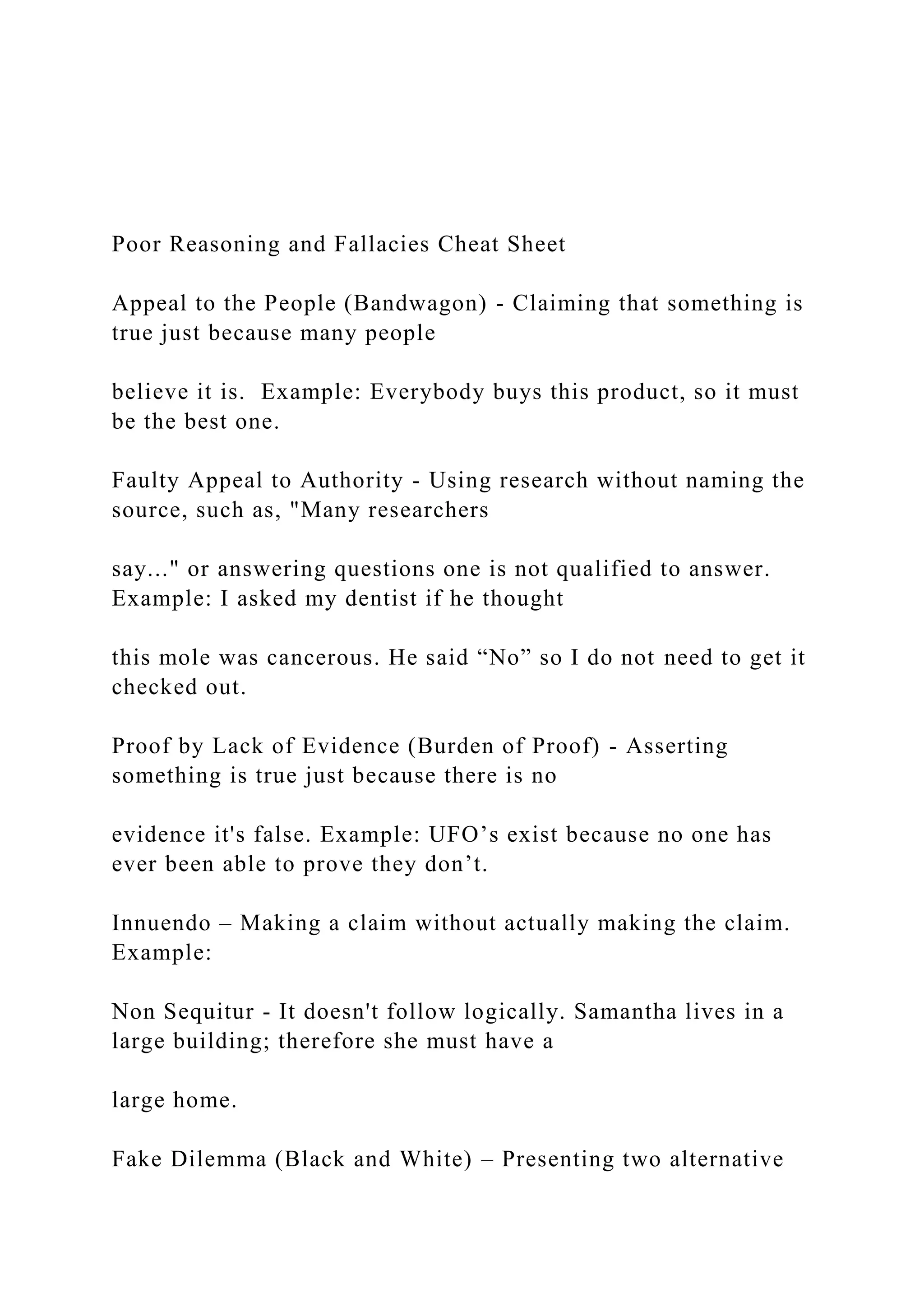 The document provides a comprehensive overview of common logical fallacies that undermine reasoning, such as appeal to authority, circular reasoning, and overgeneralization. It emphasizes the importance of critical thinking and thorough evaluation of arguments to avoid faulty reasoning, highlighting how fallacies can weaken the credibility of an argument. Additionally, it discusses the implications of media bias and propaganda on public perception and understanding of information.