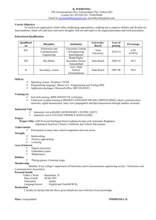 R. Poornima is seeking a challenging position where she can improve her abilities and help the organization. She has a B.E. in Electronics and Communication Engineering with a CGPA of 6.99. Her skills include operating systems, programming languages, and application packages. She has undergone soft skills and technical training. Her areas of interest are digital electronics, embedded systems, and mathematics.