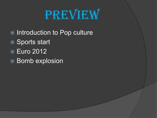 Vitali and Vladimir Klitschko are Ukrainian boxer brothers. Vitali has had a successful kickboxing and boxing career, winning multiple championships. He has also pursued a political career in Ukraine. Vladimir is a heavyweight champion boxer who has won over 130 fights. Both brothers have supported democracy movements in Ukraine. The 2012 UEFA European football championship was hosted by Poland and Ukraine, though bomb explosions injured dozens in Ukraine shortly before the tournament began, raising safety concerns.