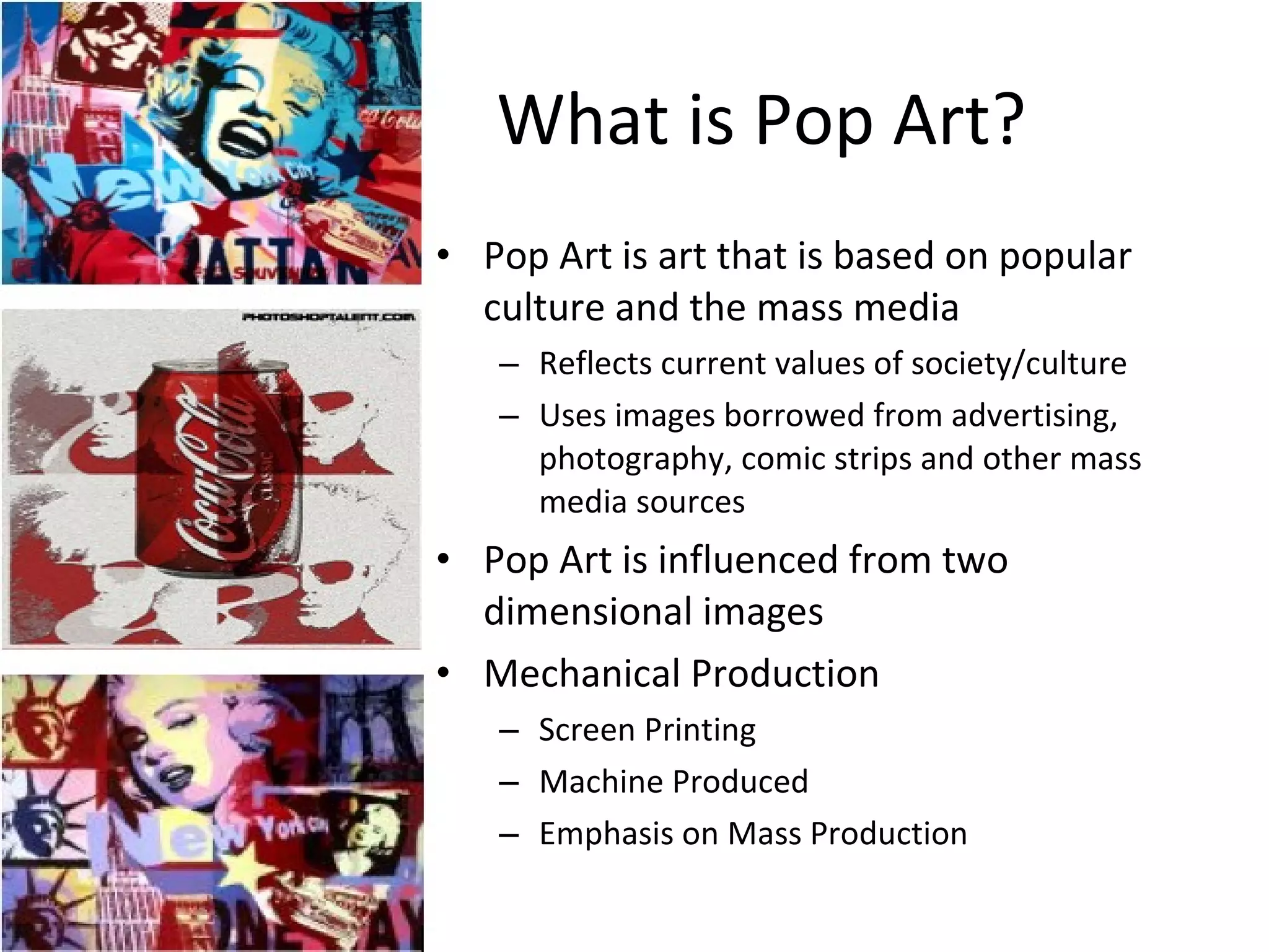 Pop Art emerged in the 1950s as a visual art movement that incorporated popular and mass media iconography into fine art. It reflected the optimism and consumerism of postwar society. Major Pop Artists like Andy Warhol, Roy Lichtenstein, and Claes Oldenburg used imagery and techniques from commercial art, advertising, and mass media to comment on the relationship between artistic expression and commodity culture. Their works employed recognizable symbols and objects in a style that was clear, colorful, and easily reproducible.