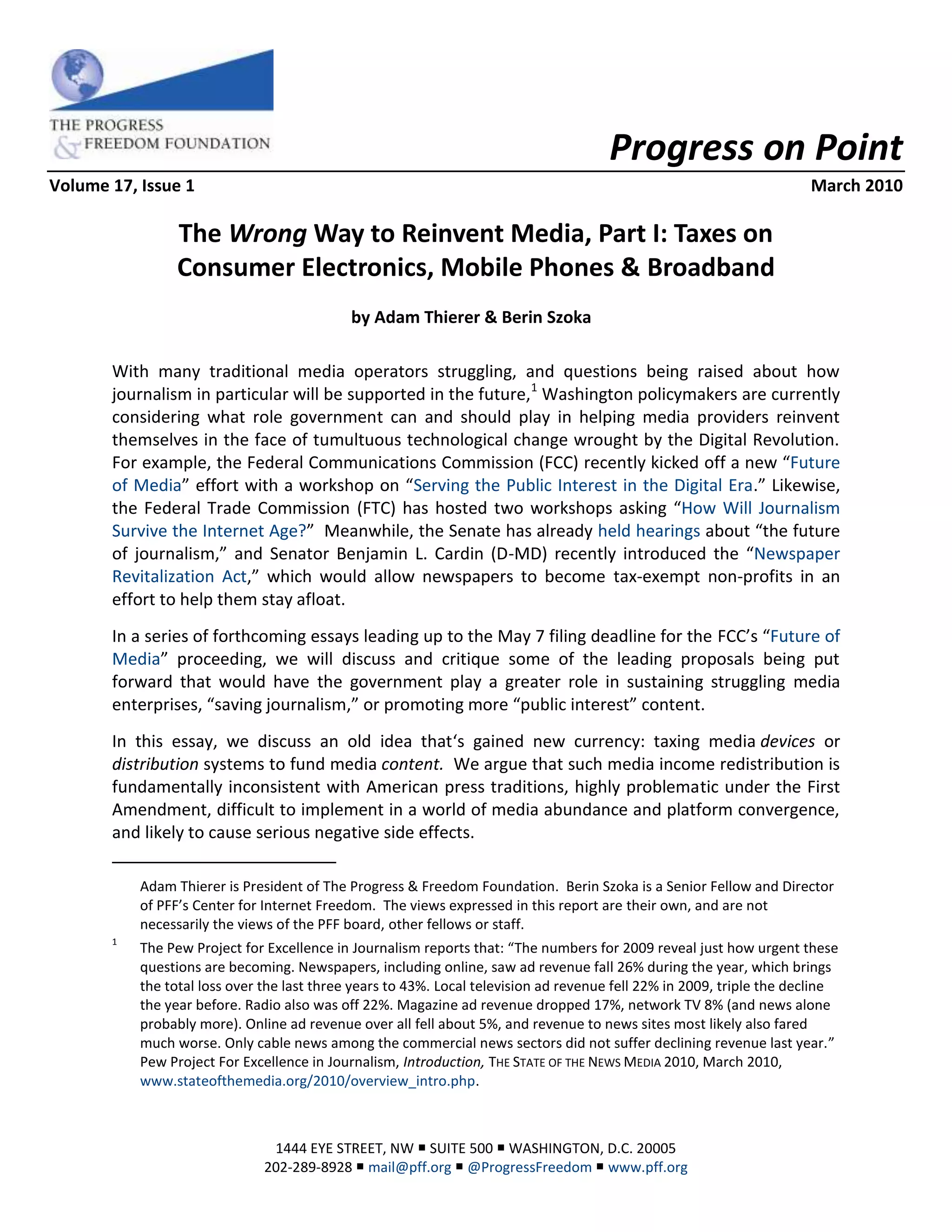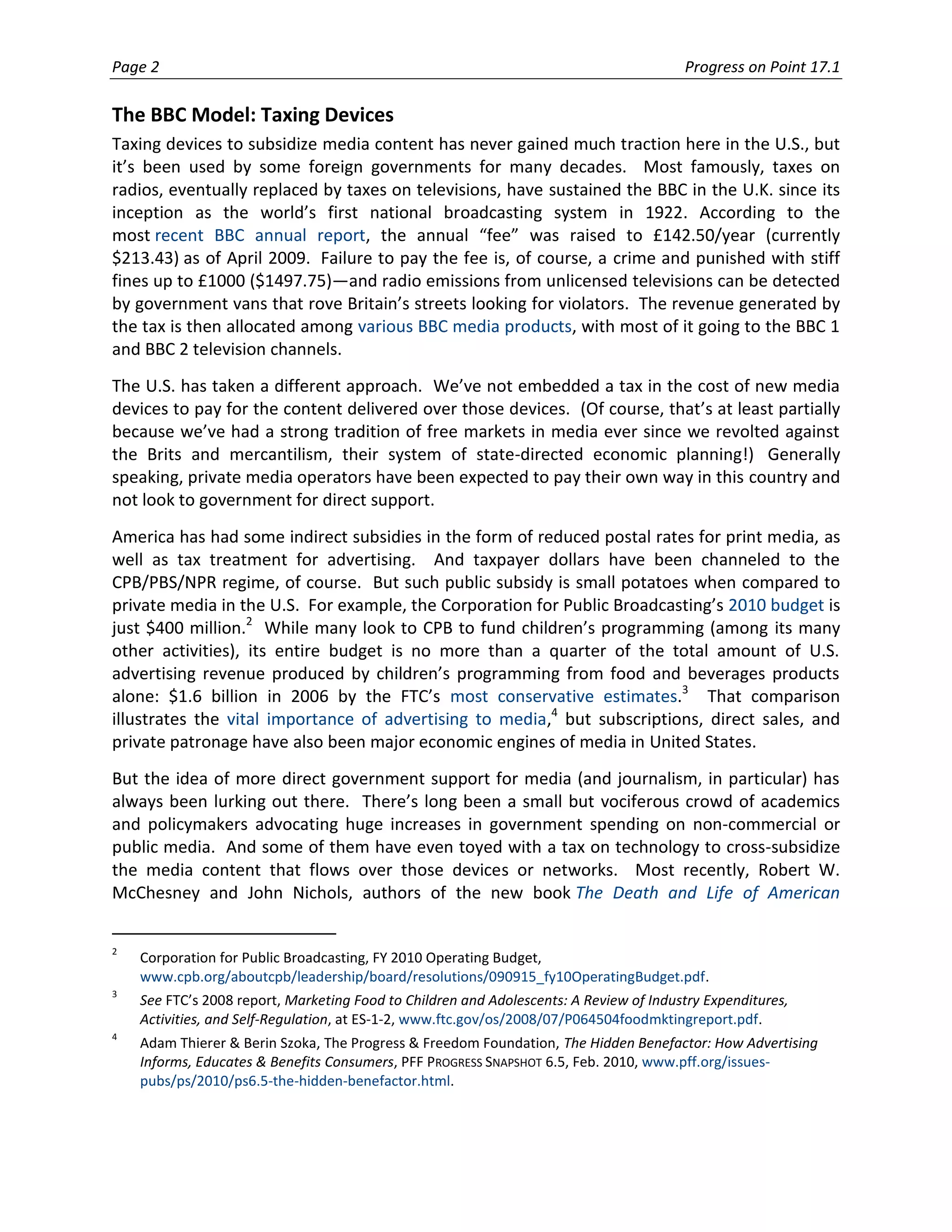 This document discusses proposals to tax consumer electronics, mobile phones, broadband internet access, and advertising in order to generate funding to support struggling media organizations and journalism. Specifically, it outlines a 4-part tax plan proposed by Robert McChesney and John Nichols to raise $18-21 billion annually for media through taxes on consumer electronics (5%), monthly internet and cell phone bills (3%), advertising (2%), and broadcasters (7%). The document argues that such media taxes are inconsistent with American traditions of free markets and the First Amendment and could have negative unintended consequences.