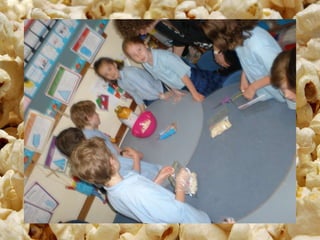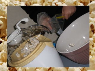 The document contains poems and instructions for making popcorn from multiple students. It describes the process of making popcorn including plugging in the popcorn maker, adding popcorn kernels, waiting for it to pop, and then enjoying the popcorn. Many of the student pieces include onomatopoeic words like "pop" to represent the sound of the popcorn popping.