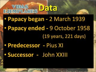 Pope Pius XII was born Eugenio Maria Giuseppe Giovanni Pacelli in Rome, Italy in 1876. He was ordained as a priest in 1899 and served in various roles within the Catholic Church, becoming the Cardinal Secretary of State in 1930. In 1939, he was elected as Pope and took the name Pius XII. As Pope, he appealed for peace during World War II and spoke out against ideologies like Nazism and totalitarianism through broadcasts on Vatican Radio. Pius XII served as Pope until his death in 1958 after 19 years as the head of the Catholic Church.