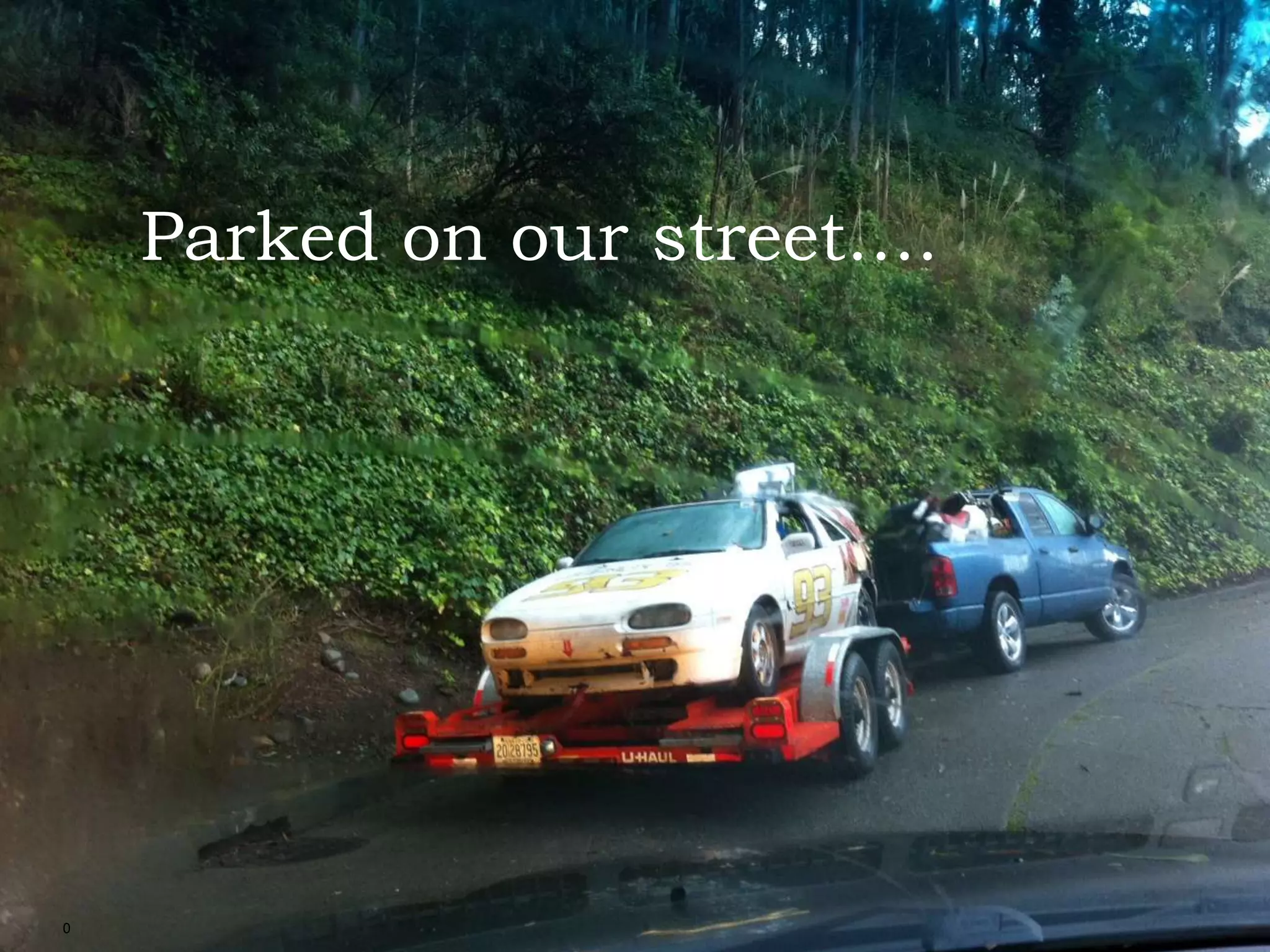 A race car was parked on the street with some unusual driver names seen, including one named "Pope Rocket". The document provides little context but seems to be noting the sighting of a race car and its oddly named drivers in a brief and somewhat humorous manner.
