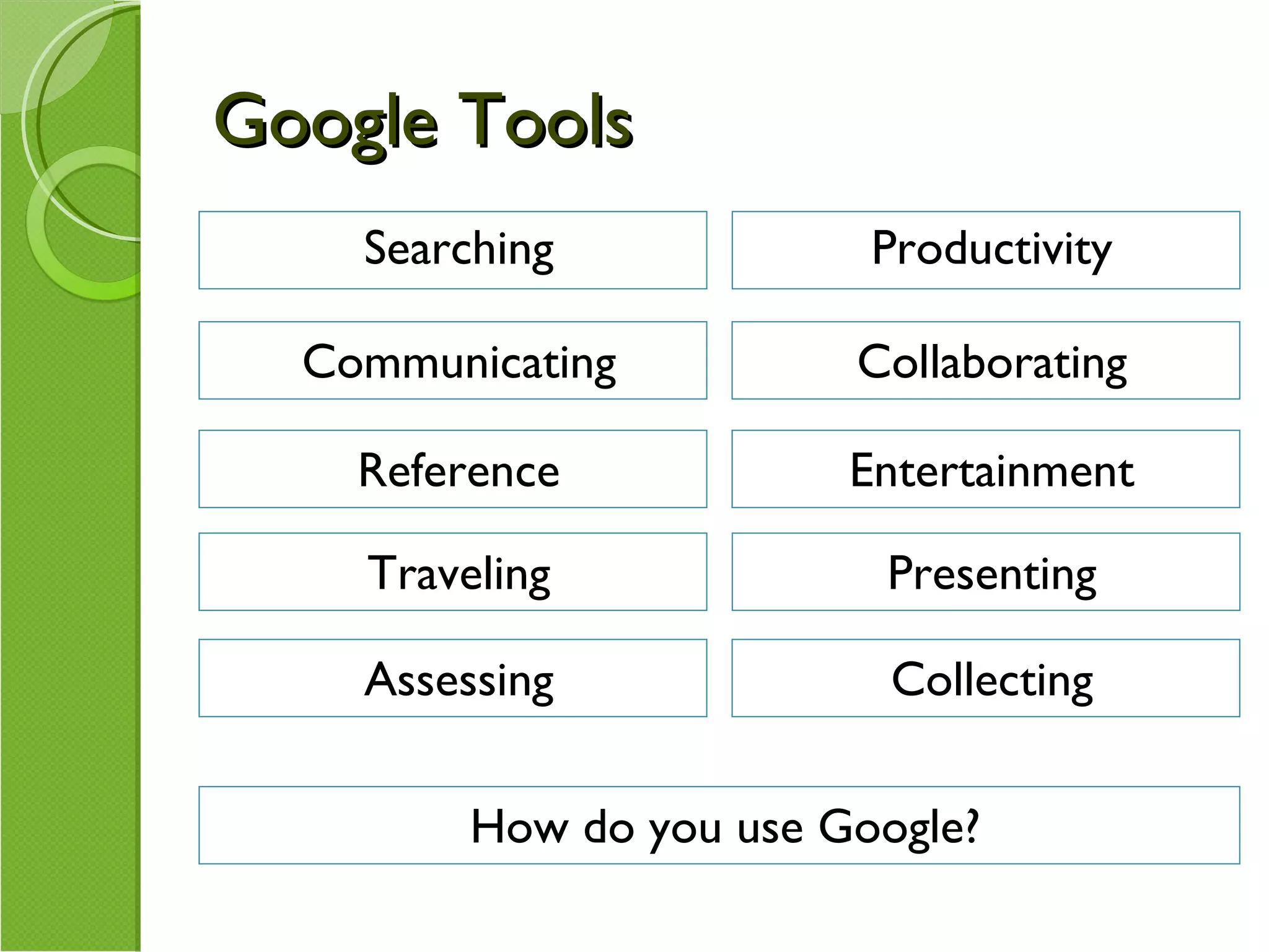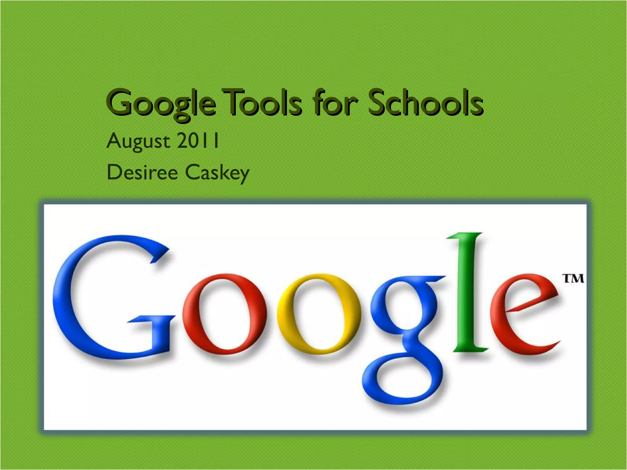 Google provides a variety of tools for schools including search tools to find information on the web, productivity tools for creating documents and presentations, and communication and collaboration tools to work with others. It also includes reference tools for looking up definitions and conversions, entertainment options for finding photos and news, and tools for travel planning and presenting information.