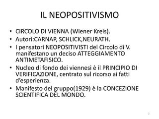 Il documento esplora il neopositivismo e le sue tesi principali, sottolineando il ruolo del Circolo di Vienna e l'importanza del principio di verificazione. Viene poi analizzato il pensiero di Karl Popper, che propone il criterio di falsificabilità come alternativa al neopositivismo e discute la natura della scienza e della società aperta. In conclusione, Popper enfatizza la necessità di limiti al potere governativo e la protezione delle libertà fondamentali.