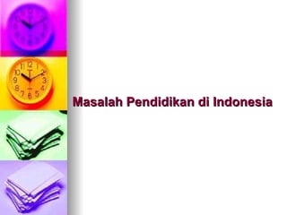 Dokumen tersebut membahas masalah pendidikan di Indonesia, termasuk kualitas pendidikan yang rendah, biaya pendidikan yang mahal, dan privatisasi pendidikan yang berpotensi mengurangi akses masyarakat miskin untuk bersekolah. Dokumen ini juga menyebutkan bahwa pemerintah perlu meningkatkan anggaran pendidikan dan menjamin akses pendidikan berkualitas bagi seluruh warga negara.