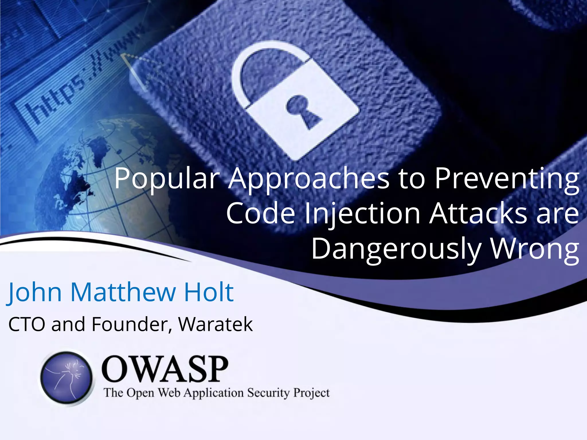 This document discusses popular approaches to preventing code injection attacks and argues they are inadequate. It introduces Tainted Lexical Analysis, Name-Space Layout Randomization, Component Privilege De-escalation, and Runtime Protection Rules as new techniques that can prevent code injection attacks without heuristics and provide always-on protection, virtual patching capabilities, and prevention of serialization vulnerabilities and API abuse. These techniques are presented as superior alternatives to traditional application security approaches.