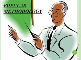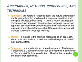 The document discusses various approaches, methods, procedures and techniques used in language teaching. An approach describes the nature of language and learning. A method is the practical application of an approach and includes procedures and techniques. A procedure is an ordered sequence of techniques. Techniques are single activities. The document then examines several specific methods in more detail, including Grammar Translation, Direct Method, Audiolingualism, Communicative Approach, Task-Based Learning and the Lexical Approach. It notes the importance of choosing eclectically based on principles like exposure, input, lowering anxiety and allowing output. Culture also influences appropriate methodology choices.