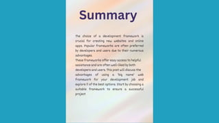 The document discusses the importance of choosing a development framework for creating websites and online applications, highlighting the benefits of popular frameworks like React, ASP.NET, and Django. It presents a list of 11 widely used web frameworks, detailing their features and suitability for different types of web development projects. Additionally, it emphasizes the significance of web hosting services for managing these projects and introduces GauravGo as a provider offering affordable hosting options.