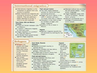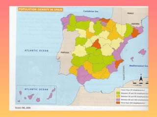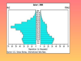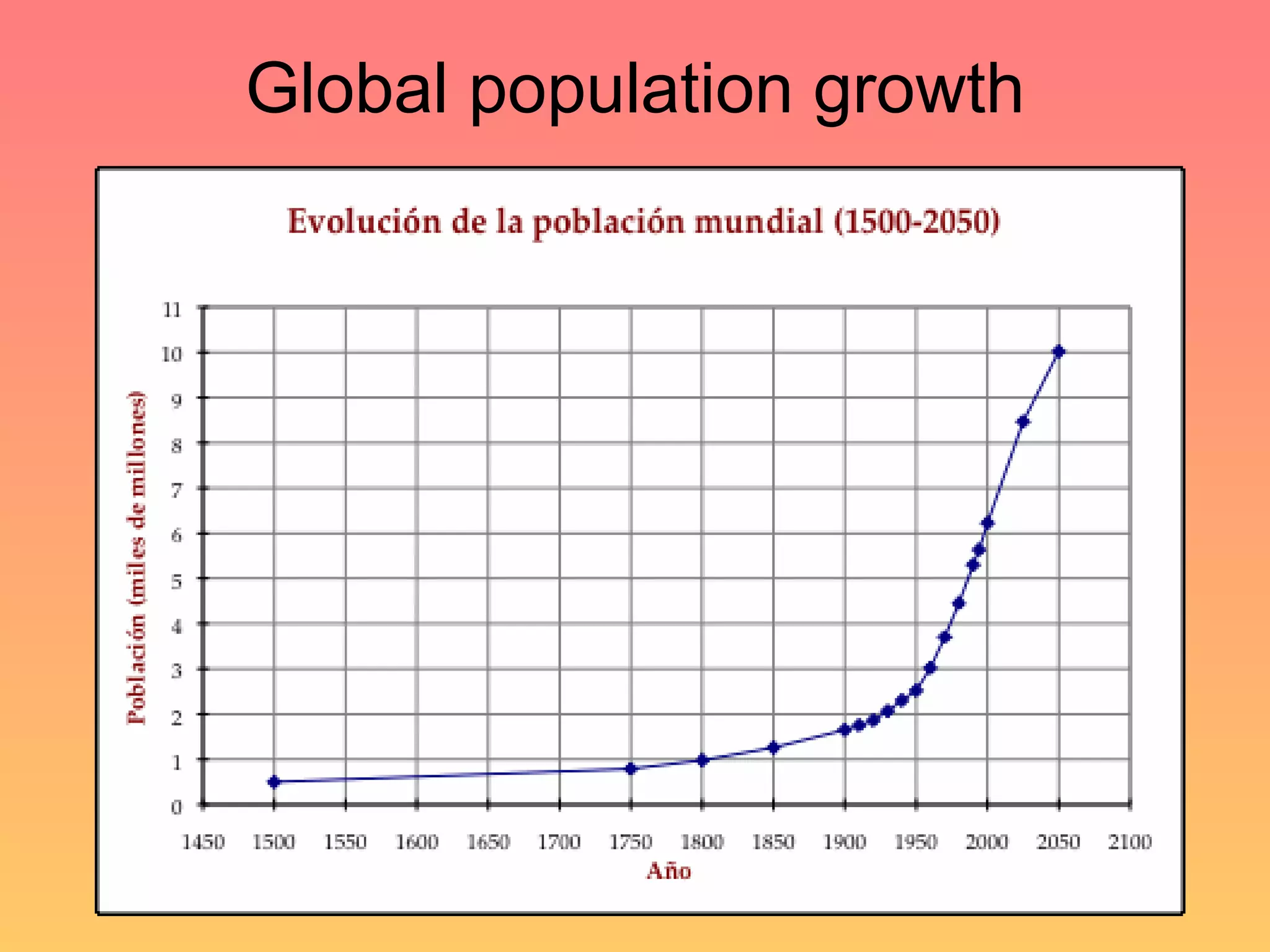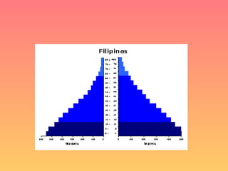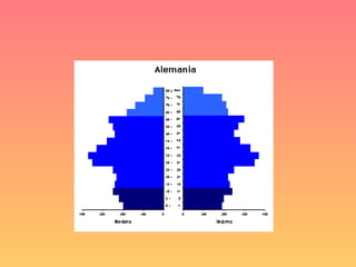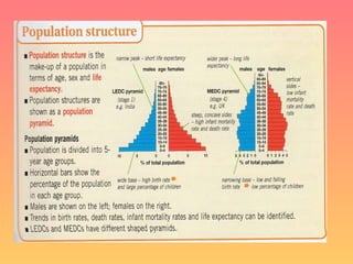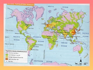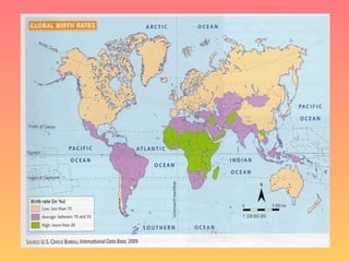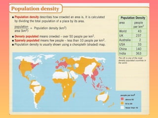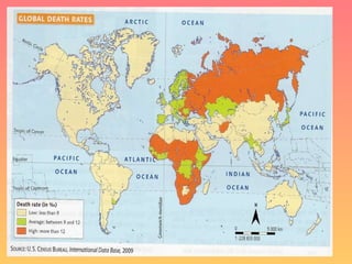 Global population growth has occurred in three stages. The first stage saw high mortality and birth rates resulting in low population increase. The second stage saw declining mortality and sustained high birth rates, leading to rapid population growth and increased life expectancy. The third stage features declining birth and mortality rates, slowing population growth. Some countries now see negative population growth. Improvements in hygiene, diet, vaccines, healthcare and medicine facilitated 19th century population growth. Population distribution is unequal due to physical factors like population density, which is the total population divided by the land area. Natality is the birth rate calculated as births per 1000 people per year. Mortality is the death rate calculated as deaths per 1000 people per year. Natural increase is the