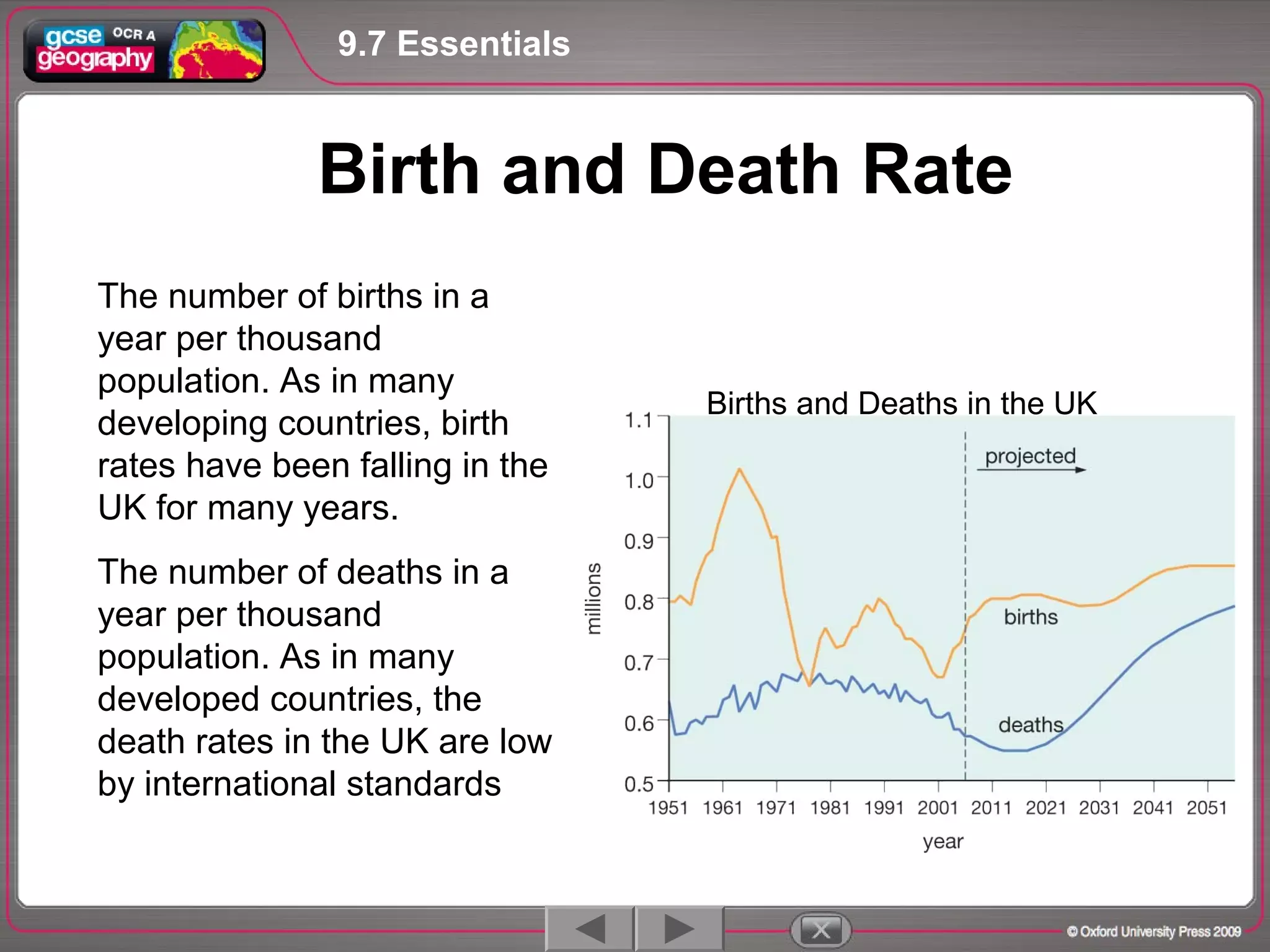 The document discusses birth rates, death rates, and population in the UK. It states that birth rates have been falling in the UK for many years, as they have in many developing countries. It also notes that death rates in the UK are low by international standards, as is the case in many developed countries.