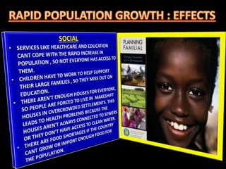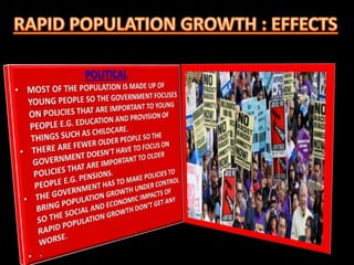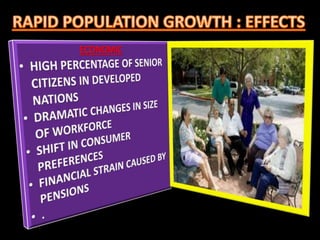 Population growth is driven by birth rates exceeding death rates. While birth rates are high in developing countries, death rates have declined globally due to improved healthcare. The world population grew rapidly in the late 20th century and is projected to reach over 8 billion by 2028 and 10 billion after 2200. Population growth will be concentrated in developing regions, with Asia and Africa seeing substantial increases. Rapid urbanization and increased migration are also emerging trends with impacts on business and the environment like water scarcity and habitat destruction.