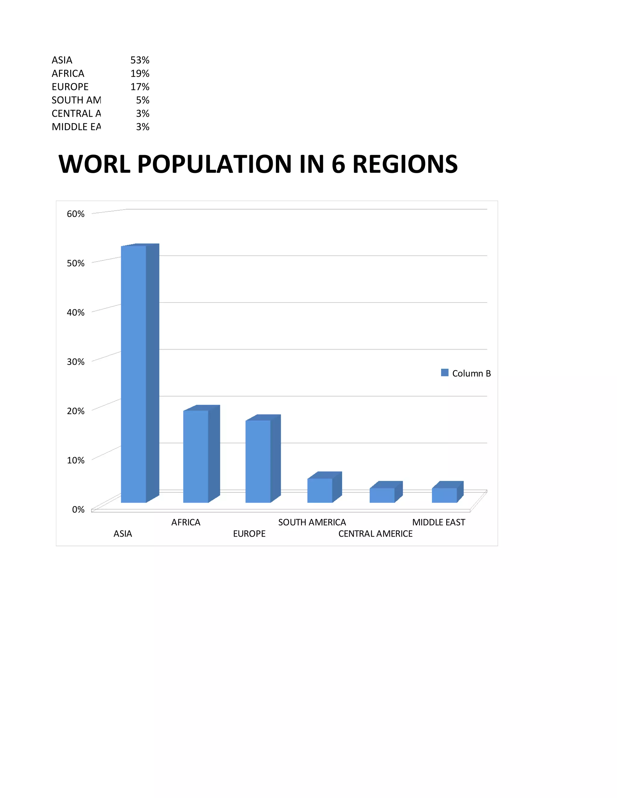 The document shows the percentage of world population living in six different regions: Asia accounts for 53% of the world population, Africa 19%, Europe 17%, South America 5%, Central America 3%, and the Middle East 3%. Asia has the largest percentage of the world's population at 53%, while Africa, Europe, and South America also account for significant portions between 17-19%.