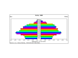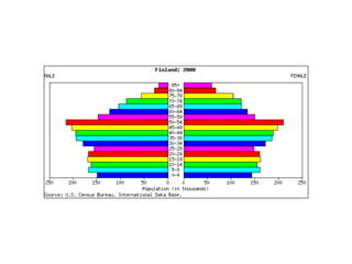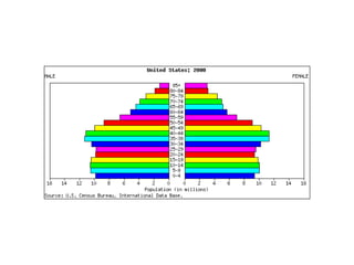 The document discusses key elements of population composition and structure, including sex ratio and age structure. It defines sex ratio as the number of males per 100 females in a population. Age structure is analyzed using population pyramids that show cohorts in 5-year age groups. The postwar US baby boom from 1946 to 1964 significantly increased births, affecting age structure. Analysis of population composition and structure is important for understanding future population growth patterns and the dependency ratio.