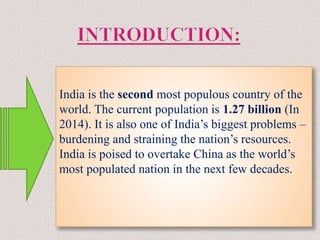India, with a population of 1.27 billion, faces significant challenges due to rapid population growth, emphasizing the need for effective human population control measures. Various strategies, including increasing the legal age of marriage, promoting family planning, and enhancing education, aim to stabilize population growth and improve public health. The National Family Welfare Programme and other governmental initiatives focus on maternal and child health, reduced birth rates, and the empowerment of women to mitigate demographic pressures.