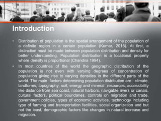 The document discusses factors that affect population distribution and provides examples. It notes that population distribution refers to the spatial arrangement of a population in a region, while density refers to proportional concentration. Key factors determining distribution include physical characteristics like climate, landforms, resources as well as human factors such as politics, economics and social organization. India is provided as a case study, with data showing it has the second largest population in the world at over 1.3 billion people distributed unevenly across its land area. The conclusion emphasizes understanding population patterns and their relationship to environmental variables is important for predicting future growth and developing sustainable policies.