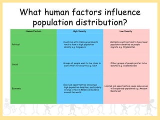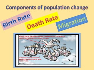 Beginning in the 21st century, the world population reached approximately 6 billion and has since grown to over 7 billion. Population density is measured as the number of people per square kilometer, and can be categorized as high (over 200 people/sq km), middle (11-50 people/sq km) or low (1 person/sq km). Population growth or change refers to the change in a population's size over a specific time period, and can be positive if the birth rate exceeds the death rate, or negative if the birth rate falls below the death rate. In addition to births and deaths, migration between locations also impacts population size.