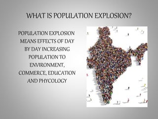 The document discusses population explosion in India, defining it as the rapid increase in population that negatively impacts the environment, economy, education, health care, and human psychology. Some key points made include: India's population is over 1.3 billion people, comprising 17.5% of the world's population; reasons for the population explosion include increased birth rates and decreased death rates; effects are environmental degradation, poverty, unemployment, overcrowded hospitals, and increased crime rates. Solutions proposed are increasing education, birth control, social awareness campaigns, abortion access, and government policies and mandates.