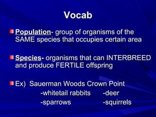 This document discusses key concepts in population genetics, including defining a population as a group of the same species occupying a certain area. It explains that population sampling is used to study a subset of a population. The document defines a gene pool as all the genes in a population sample and discusses how allele frequencies are calculated based on genotypes in the sample. An example is provided to demonstrate calculating allele frequencies for fur color in a population of 100 rabbits. The principles of Hardy-Weinberg equilibrium are introduced, which state that allele frequencies will remain the same over generations if five strict conditions are met, but these conditions are never fully satisfied in real populations.