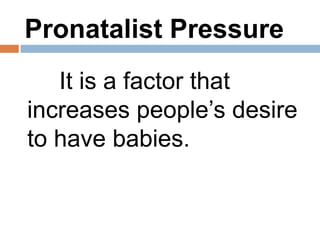 There are opposing factors that influence population growth rates. Pronatalist pressures increase desire to have children while birth reduction pressures in developed countries, like higher education and women's freedom, result in fewer children. Most countries experience a demographic transition as development improves living conditions and death rates fall faster than birth rates. Some experts believe this transition will lead world population to stabilize in the 21st century, while others warn many poor countries may be trapped in high population growth due to resource shortages preventing development. Ensuring social justice, women's empowerment, child survival and access to family planning are key to successfully slowing growth rates.