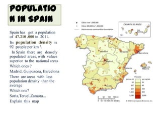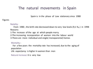 Spain has a population of 47.21 million people in 2011, with a population density of 92 people per square kilometer. Some areas like Madrid, Guipuzcoa and Barcelona have population densities higher than the national average, while other areas such as Soria, Teruel and Zamora have lower densities. The natural growth rate in Spain has been low since 1980 due to factors like older marriage ages, more women in the workforce, and more single-parent homes. The mortality rate has also increased due to an aging population, though life expectancy is higher for women than men.