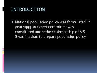 The document summarizes the history and goals of India's national population policies. It discusses how the first policy was introduced in 1952 to stabilize population growth. Subsequent policies in 1976, 1983, and 1991 emphasized small family norms and health targets. The current 2000 policy aims to reach population stability by 2045 through education, women's empowerment, health services, and decentralization. Its intermediate goal is to reach replacement fertility levels by 2010 and its reproductive, child, and general health targets for that year. Full implementation of the 2000 policy is expected to reduce projected population in 2010 from 1162 to 1107 million.