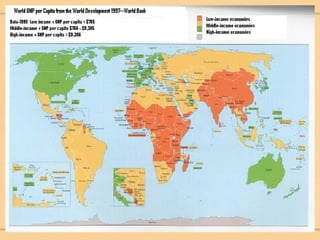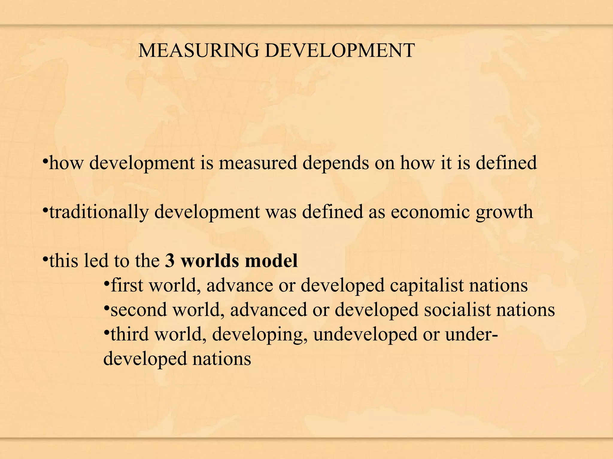 Traditionally, development was defined and measured through economic indicators like GNP per capita. However, modern definitions see development as improving quality of life through meeting basic needs, social justice, health, education, and freedom. Quality of life is now commonly measured through indices like the Physical Quality of Life Index, Human Development Index, and International Human Suffering Index which use a broader range of social and economic factors. However, accurately measuring development remains challenging due to limitations in data collection and inequality within countries.