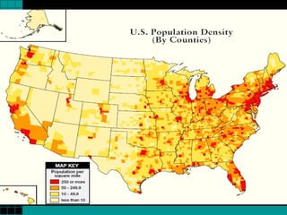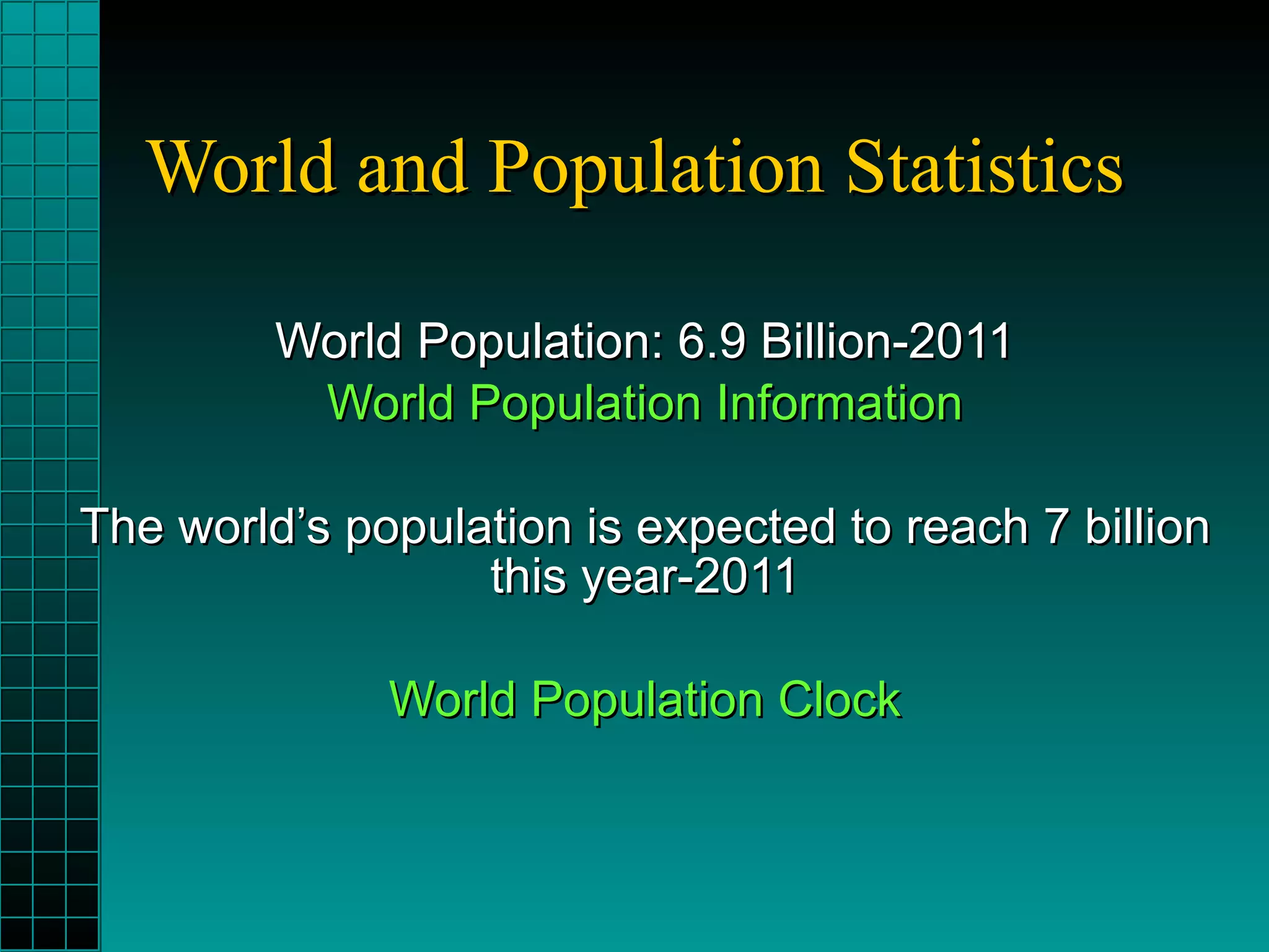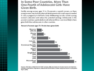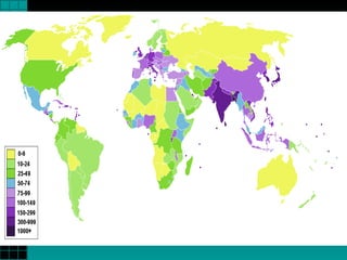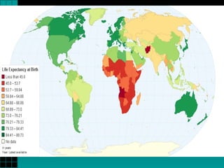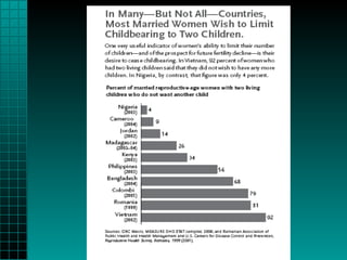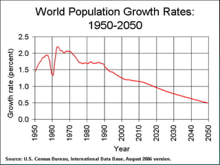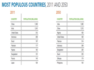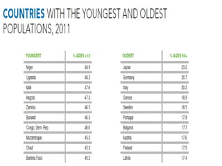 1. The document provides statistics on current and projected world population trends, including population growth rates, life expectancies, fertility rates, and population densities of different countries and regions.