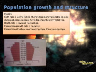 The document discusses population and migration. It defines population as a group of organisms of the same species living in the same area. It then discusses India's large population, with Uttar Pradesh being the most populated state. The document also summarizes the five stages of population growth according to the Demographic Transition Model. Rapid population growth can create social, economic and political challenges for countries. Governments implement policies like birth control programs and immigration laws to control population growth in a sustainable way. The document also discusses the impacts of aging populations and strategies countries use to address these impacts. It defines migration and discusses push and pull factors, as well as the positive and negative impacts of migration on both source and receiving countries.