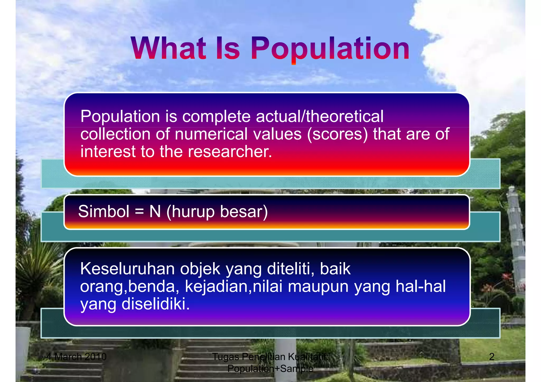 The document discusses the key differences between population and sample in research. It defines population as the entire group being studied, while a sample is a subset of the population used to make inferences. Sample size is important for statistical analysis, as larger samples produce more accurate results. Random sampling is preferred as it gives each member of the population an equal chance of being selected for the sample.
