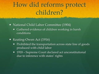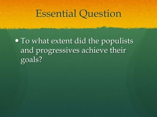 The document summarizes the rise of populism and progressivism in the late 19th century United States. Farmers faced economic hardships like falling crop prices and rising costs, leading them to form alliances to address their grievances. This gave rise to the Populist Party in the 1890s, which promoted reforms like increased money supply and regulation of railroads. Though the party collapsed after 1896, progressivism continued and sought to protect social welfare, promote moral reform, and create economic and political reforms at local, state, and federal levels through the early 20th century. Women played a leading role in many reform movements.