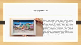 Pop-up adalah karya kreatif 3D dari kertas yang semakin populer di Indonesia. Dokumen menjelaskan tentang apa itu pop-up, sejarahnya, dan langkah-langkah pembuatan pop-up mulai dari desain, cetak, pemotongan, perakitan, hingga pengemasan. Karya pop-up lokal saat ini lebih banyak dibuat untuk kegiatan komunitas daripada komersial.