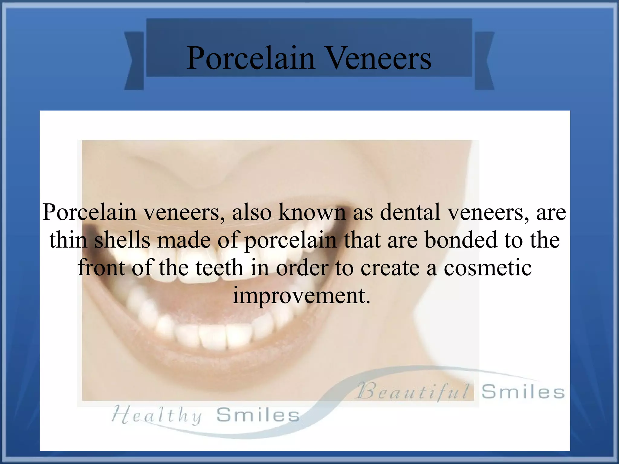 Porcelain veneers are thin shells bonded to teeth to enhance their appearance, offering a natural, healthy look that resists stains. They typically cost between $700 and $1,000 per tooth and require multiple dental visits, with costs varying based on the dentist's skill and lab quality. With proper care, veneers can last between 10 to 50 years and are treated similarly to natural teeth.
