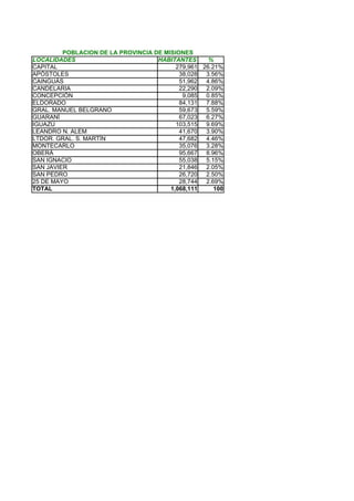 The document provides population statistics for localities in the province of Misiones, Argentina. The capital, Posadas, has the largest population at 279,961 people, accounting for 26.21% of the province's total population. Oberá is the second most populated locality with 95,667 residents, followed by Iguazú with 103,515 people. In total, the population of the province of Misiones is 1,068,111 people.