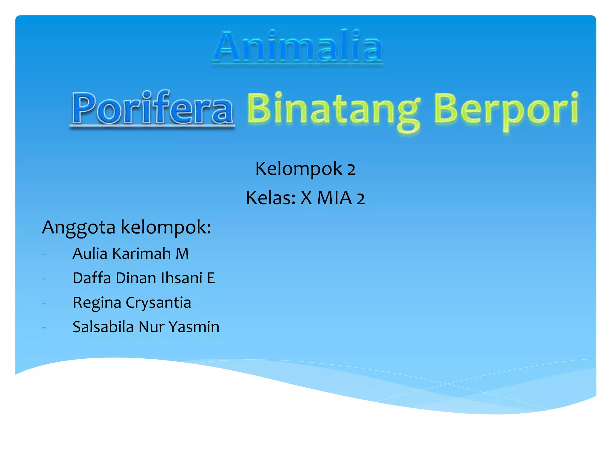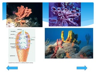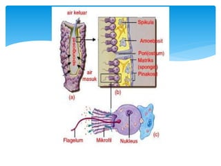Kelompok 2 menguraikan ciri-ciri dan sistem tubuh Porifera. Hewan ini memiliki tubuh berpori, sistem saluran air sederhana, dan reproduksi baik secara seksual maupun aseksual. Porifera mendapatkan makanan dengan menyaring partikel dari aliran air yang masuk, serta bernafas melalui difusi gas di sel-sel permukaan tubuh.