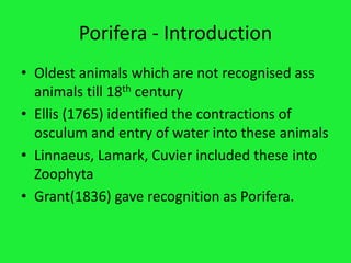 This document provides information about the phylum Porifera (sponges). It discusses their general characteristics such as being multicellular, solitary or colonial, having a canal system for water flow, and having skeletons made of silica spicules or spongin fibers. The phylum contains three classes - Calcarea, Hexactinellida, and Demospongia - which are classified based on their skeletal structures and compositions. Examples of orders and genera within each class are also provided.